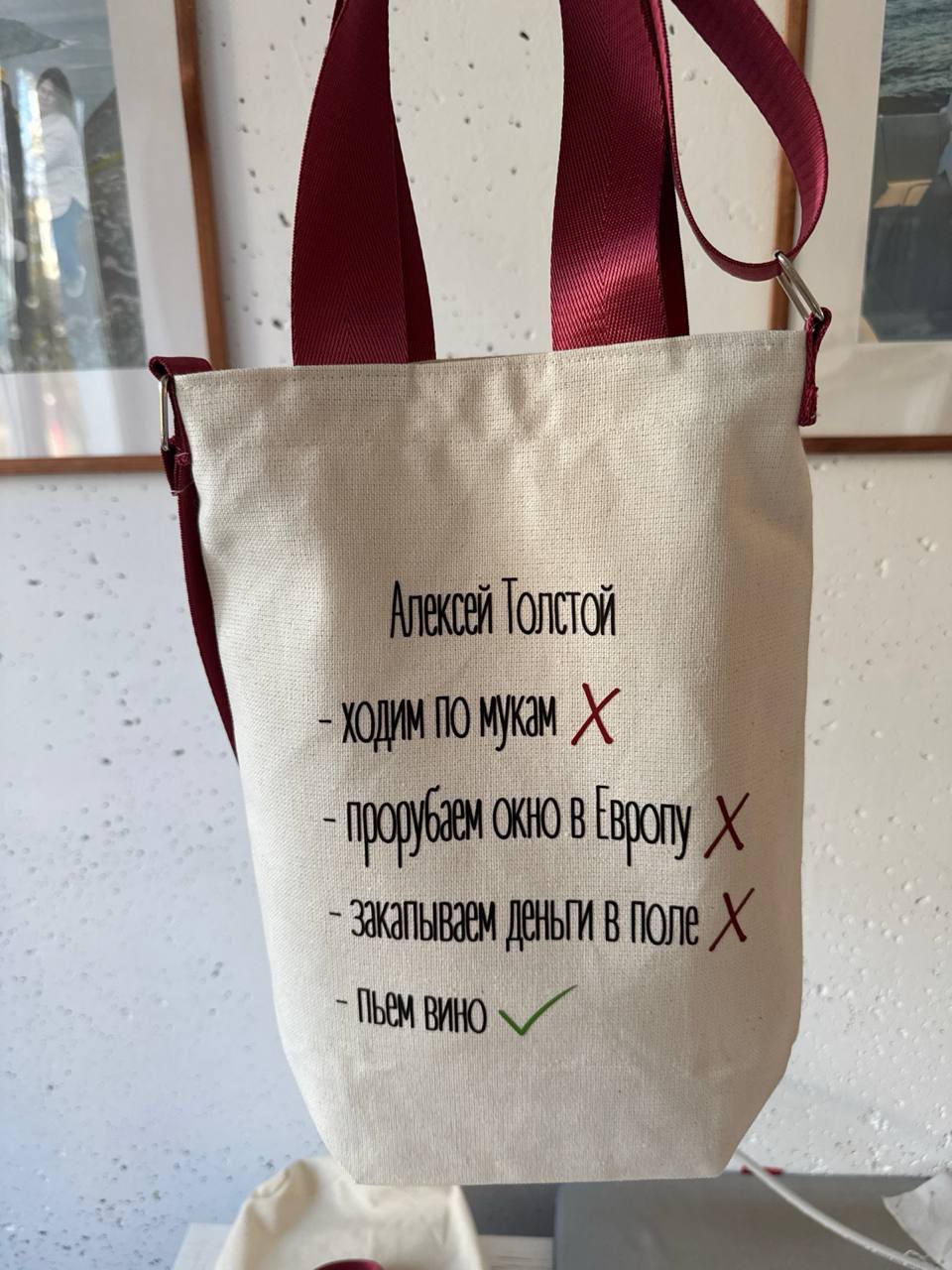 • тематическая сумка с отсылкой к произведениям Алексея Толстого , с юмором .
